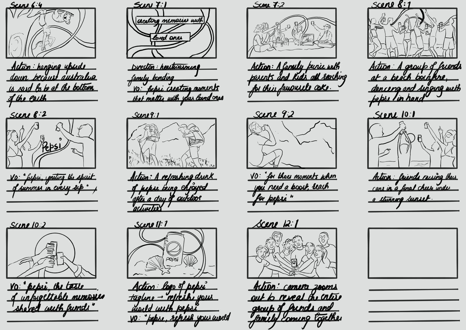 This project reimagines a Pepsi advertisement through storyboard and animatic development. Starting from a provided frame-by-frame brief, I introduced my own design twists, including a flowing ribbon-like Pepsi logo that unravels across the scenes before resolving back into the brand mark. The work explores branding, motion design, and narrative flow in a commercial context.